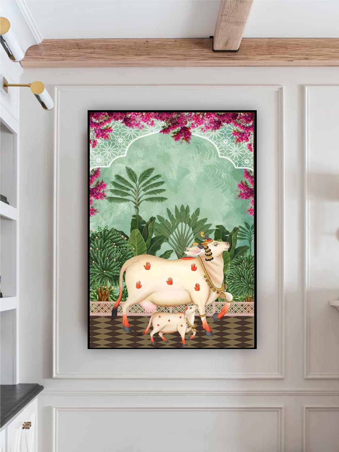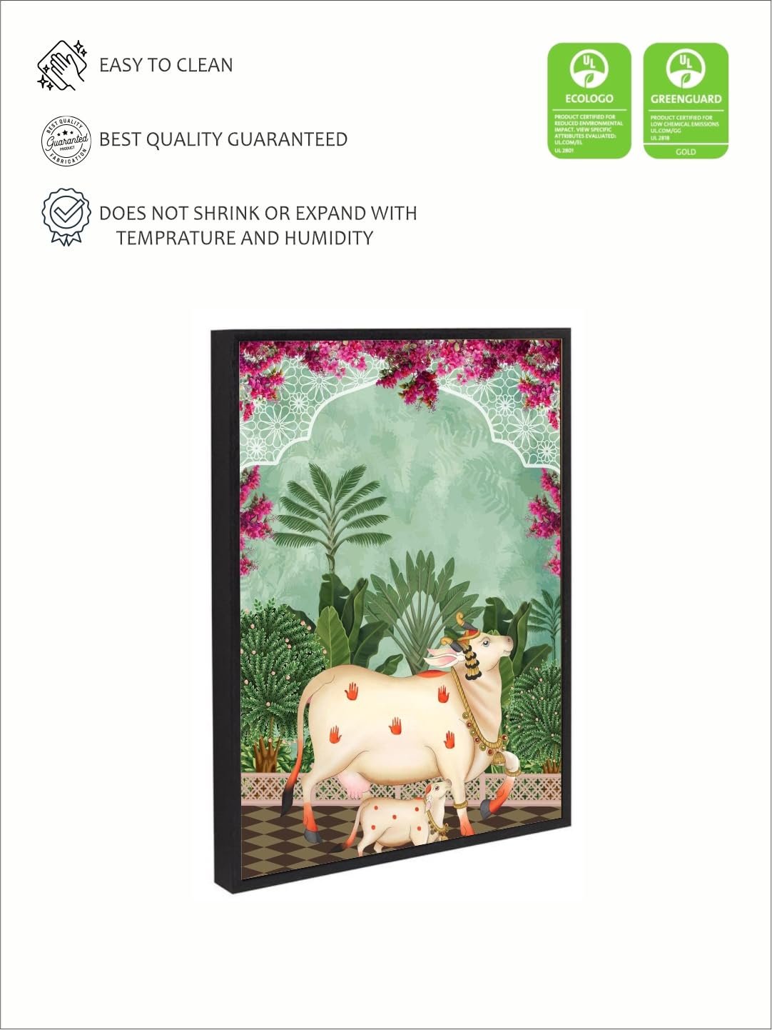 Artsense Kamdhenu Cow with Calf Canvas Wall Art with Floating Frame | Spiritual Vastu Painting 20x30 Inches (50x75 cm) | Framed Wall Decor for Home, Temple & Office