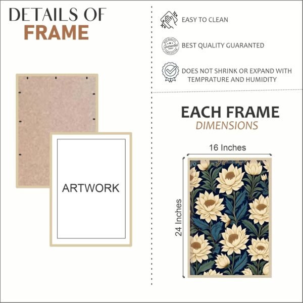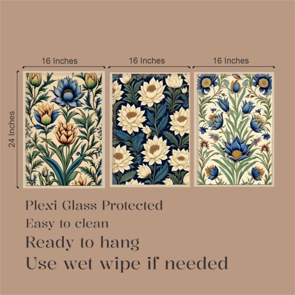 Bring artistic elegance to your walls with the Artsense Floral Wall Art Set of 3. Each frame measures 16×24 inches (40×60 cm) and showcases stunning botanical designs with blooming lotus and blue flowers, inspired by traditional Indian-style artwork. Crafted on premium vinyl and protected with plexiglass, these framed prints are durable, dust-resistant, and easy to clean with a soft wet wipe. Lightweight frames come ready to hang, making them the perfect choice for enhancing your living room, bedroom, dining area, or hallway with cultural sophistication. This floral wall décor set also makes a thoughtful gift for weddings, housewarmings, festivals, and special occasions.