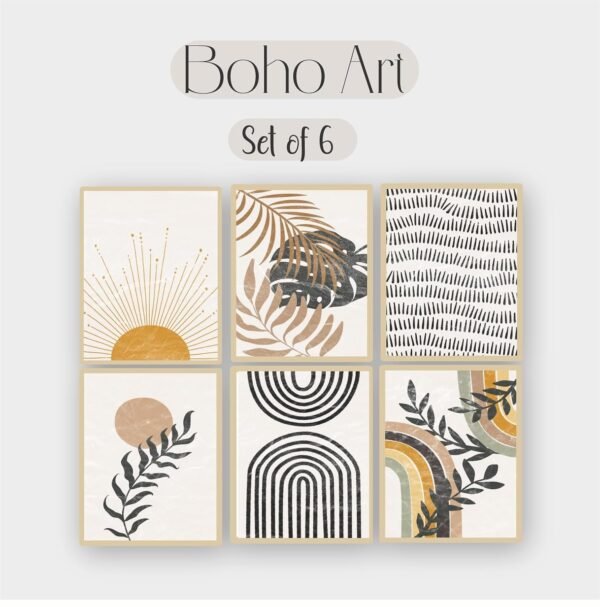Bring a refreshing modern vibe to your walls with the Artsense Set of 6 Framed Vinyl Wall Art Prints. Each frame measures 10×13 inches (25×33 cm) and features clean, minimalistic abstract designs including golden sun, tropical leaves, and geometric patterns. Printed on premium vinyl and protected with plexiglass, these artworks are durable, easy to clean, and resistant to dust and moisture. This 6-piece wall art collection is lightweight, framed, and comes ready to hang, making it a convenient choice for decorating bedrooms, living rooms, offices, and hallways. The balanced combination of nature-inspired and geometric artwork creates a harmonious modern aesthetic, perfect for both home and workspace interiors. A stylish decor upgrade for yourself and also an ideal gift for housewarmings, weddings, festivals, or special occasions.