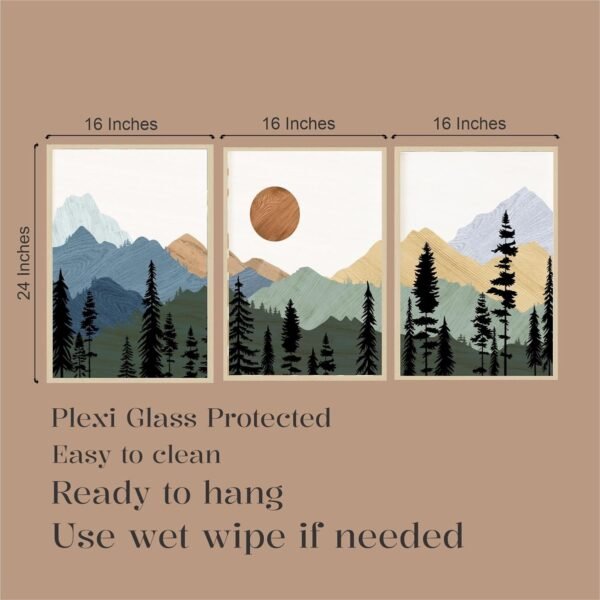 Artsense Mountain Landscape Wall Art Set of 3 Frames – 16×24 Inch Large Nature Prints with Forest, Mountains & Sun – Modern Scenic Vinyl Artwork with Plexiglass for Living Room, Bedroom, Office & Home Decor – Ready to Hang